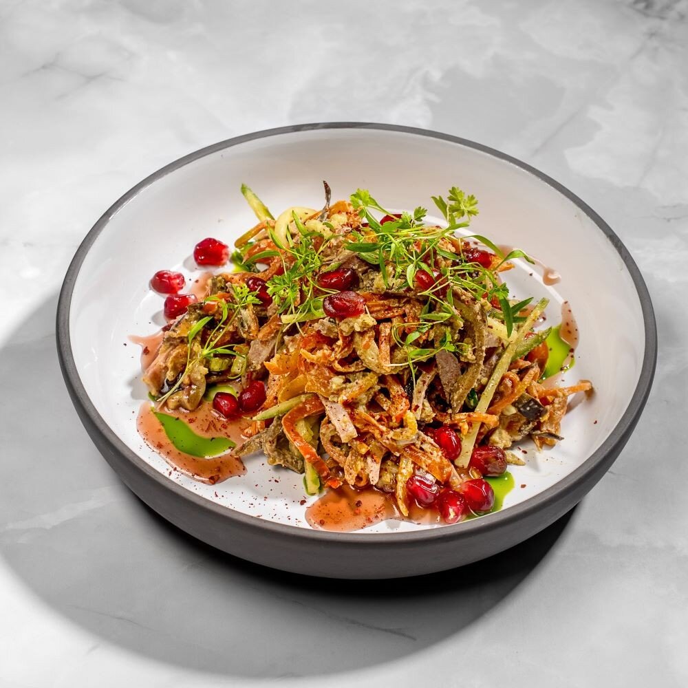 морковь, болгарский перец, баклажан, огурец, язык говяжий, зелень, грецкий орех, гранат, соус наршараб