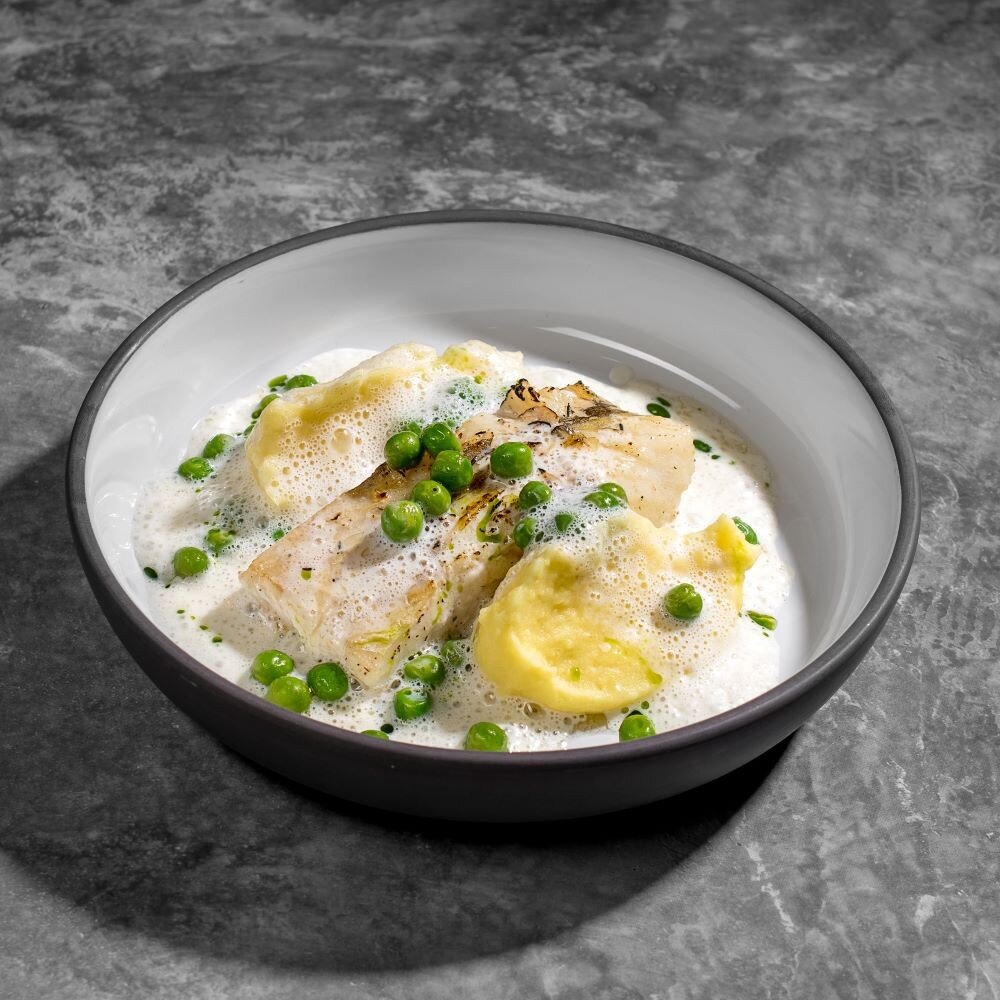 Цыпленок с кремом из корня сельдерея, белыми грибами и соусом из печеного