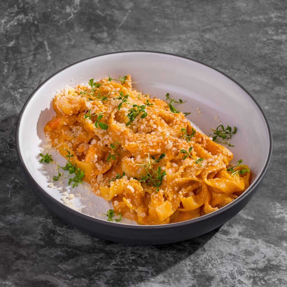 феттучини с тигровыми креветками? кальмарами, паста Том Ям с сыром